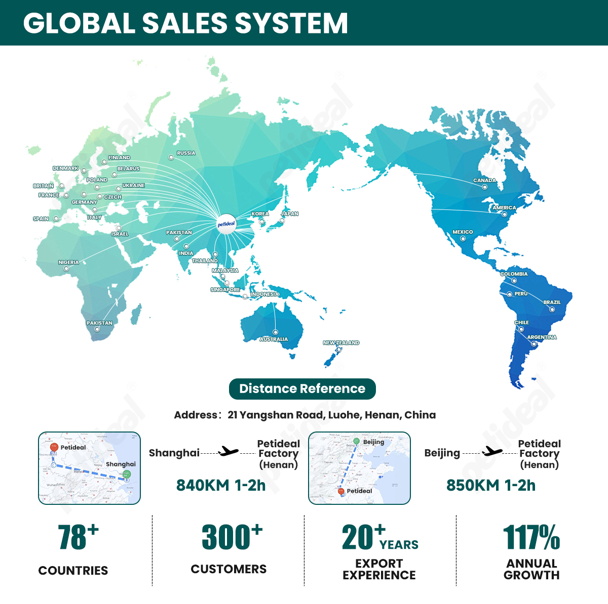 Petideal is a trusted global pet business partner with over 20 years of experience, connecting pets and people in 78+ countries worldwide. We specialize in providing innovative pet products, reliable pet supply chain solutions, and high-quality pet nutrition options, serving more than 300 satisfied clients across the globe.